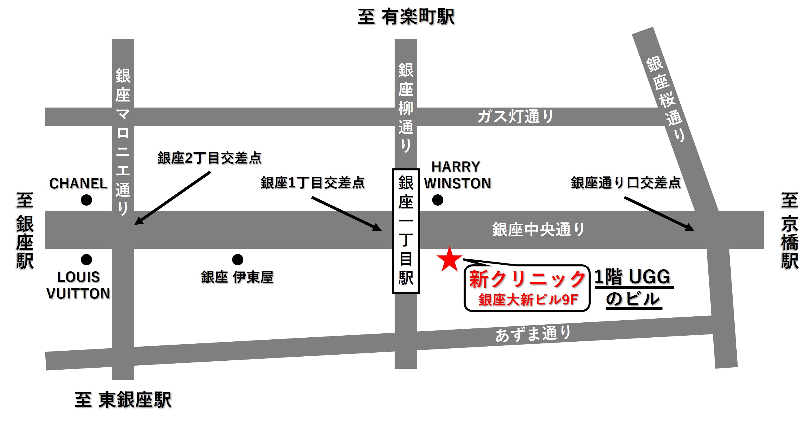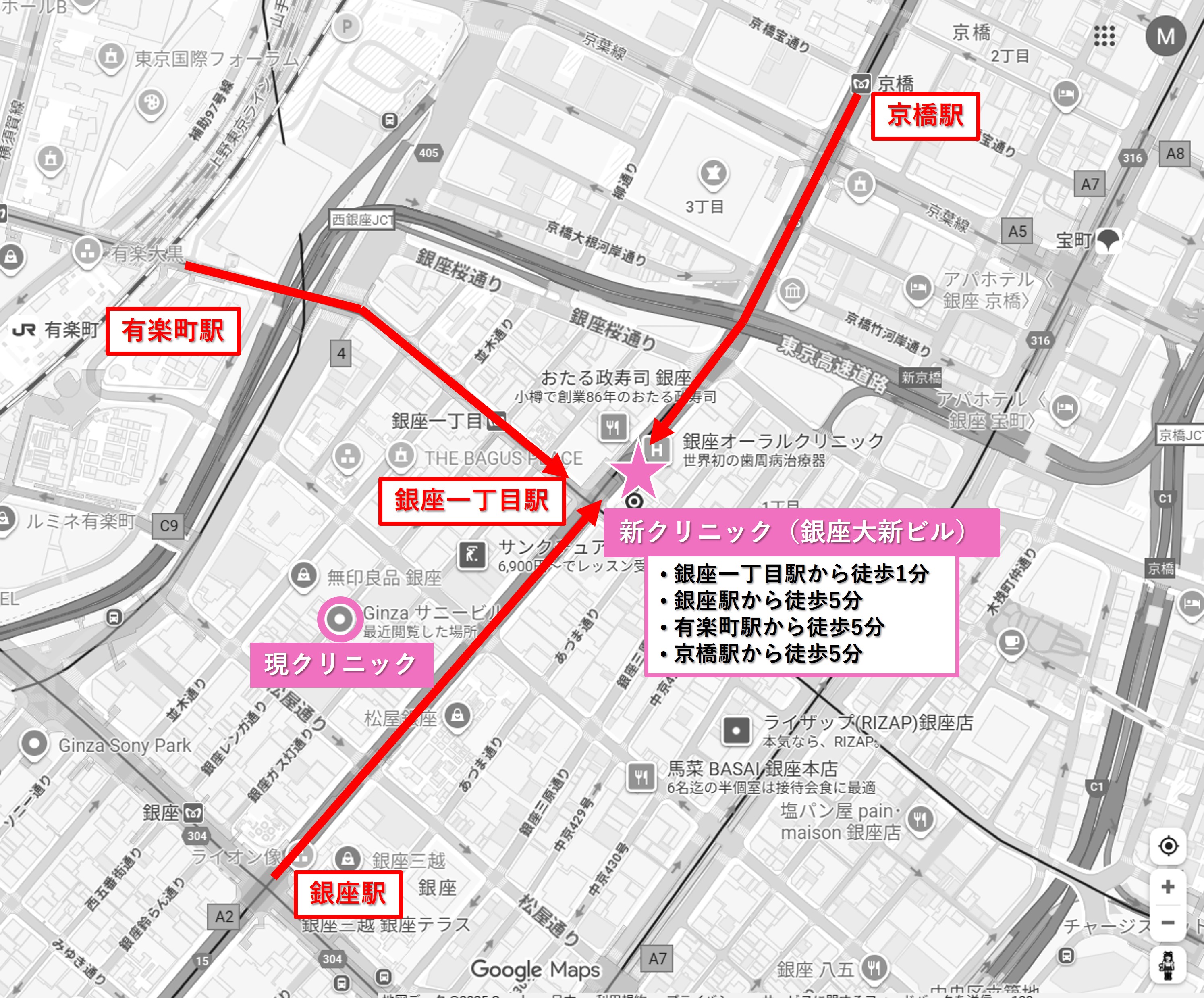 移転先は銀座大新ビル9階(銀座1丁目中央通り沿い・現在のクリニックから約300m:徒歩4分)になります。